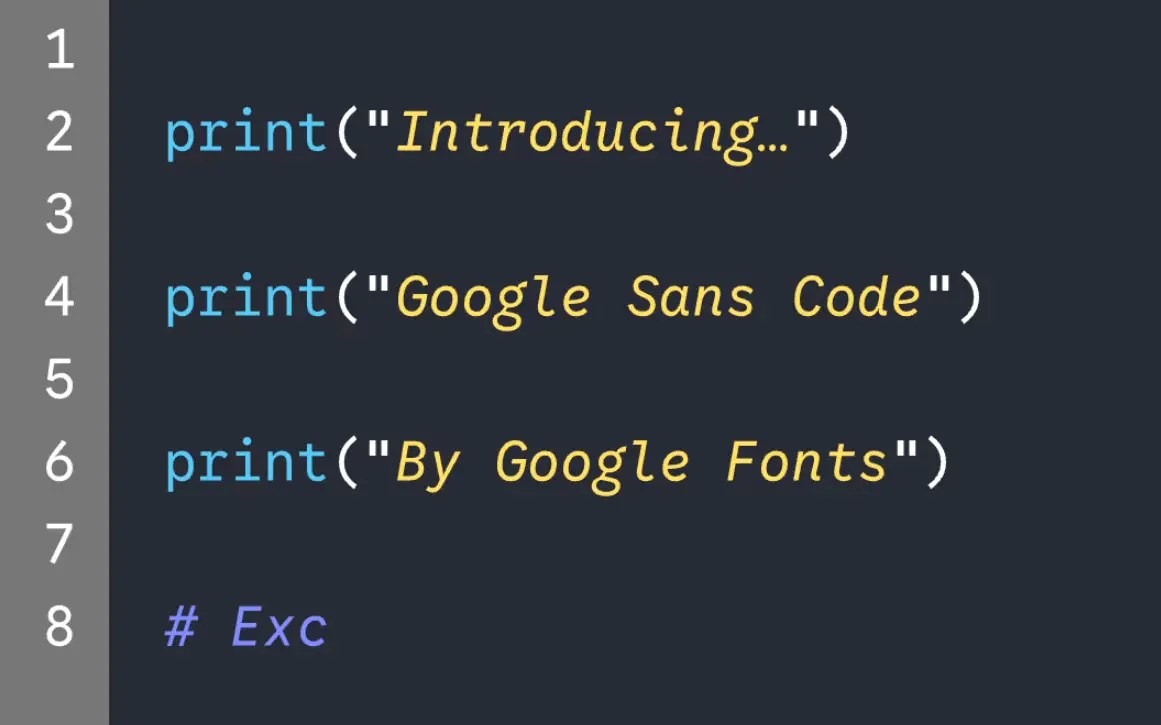 Google Sans Code is a fixed-width, geometric sans-serif typeface developed to complement Google’s corporate branding fonts. Derived from our other brand fonts, this typeface has been crafted specifically for writing and reading code, and enhanced for clarity at text dimensions typically used in programming interfaces.